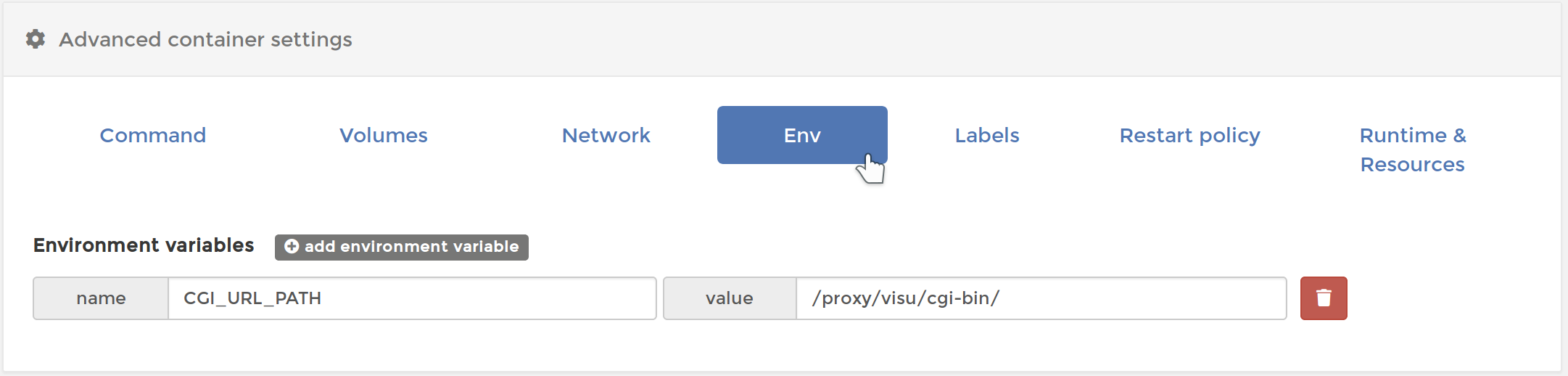name:CGI_URL_PATHwithvalue:/proxy/visu/cgi-bin/Depending on the local environment, additional customizations may be required, as specified in the section of the Docker Container.