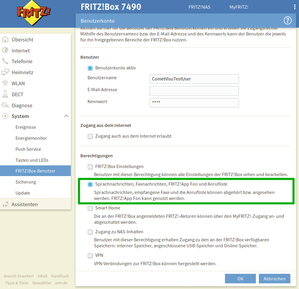 To get access to the call list of the Fritz!Box a user with according permissons must be created (or an existing user account must be used). This is possible on the user page: